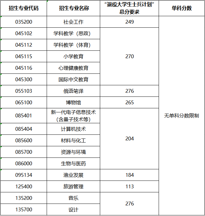 二、“退役大学生士兵计划”的分数线按照国家分数线(二区)基础上降分录取。具体成绩要求如下表: